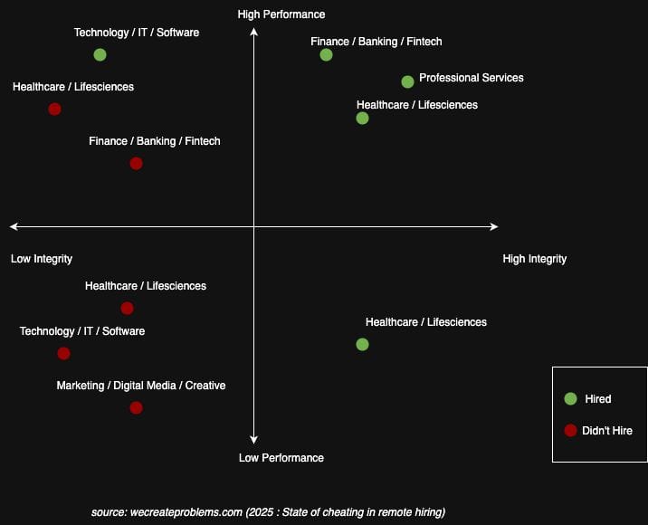Interestingly, some Healthcare candidates with modest performance but high integrity still secured roles, showing organizations value trust over raw output. The pattern reflects today’s AI dilemma: candidates can use AI to perform better, but misuse erodes trust. Companies must define an AI philosophy to balance performance with integrity in hiring.