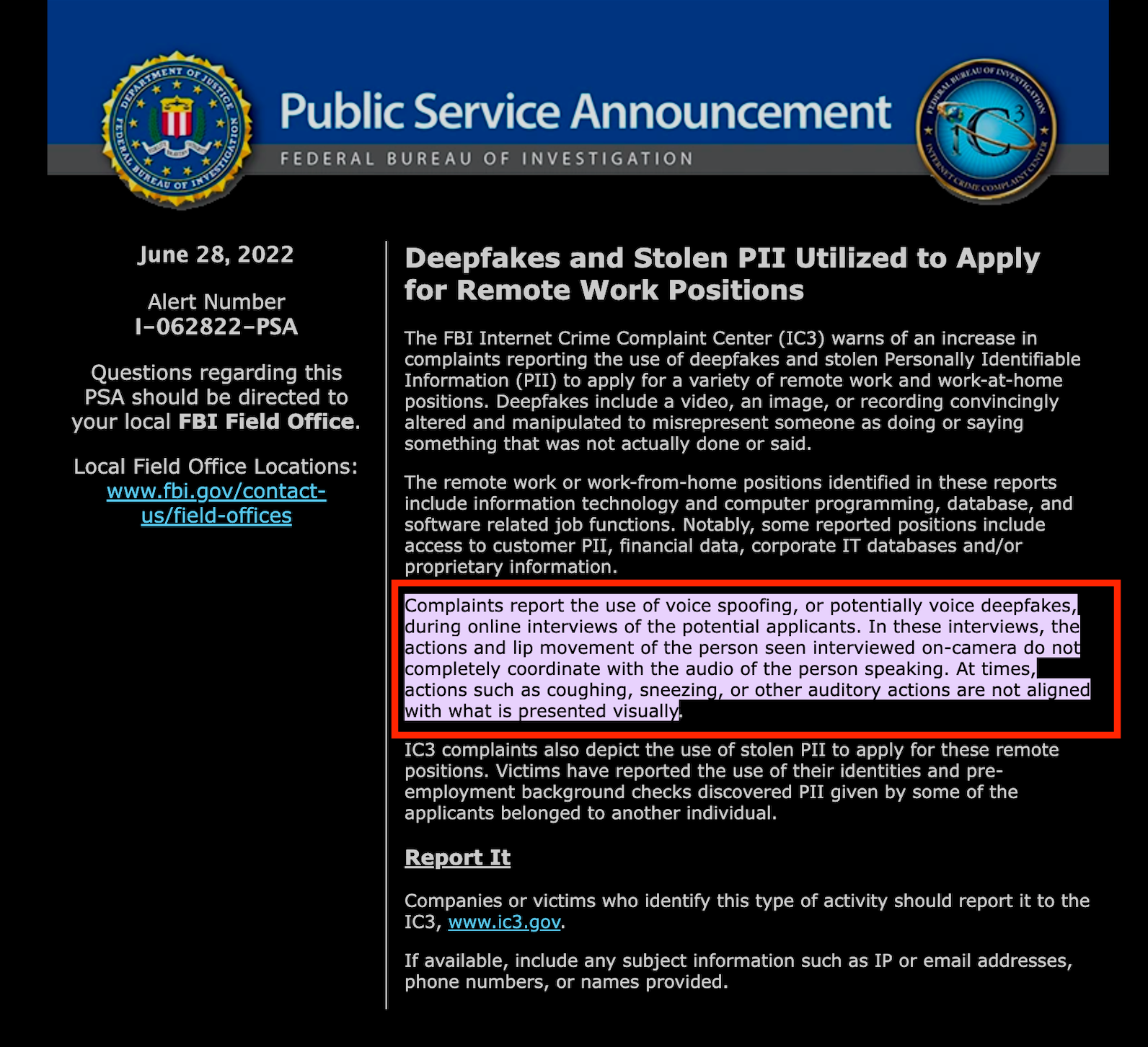 The emergence of deepfake technology around 2018–2020 (initially used to create face-swapped videos and synthetic voice clips) added a troubling new dimension. Early on, deepfakes were mostly seen in celebrity face-swaps and misinformation campaigns. But by 2021–2022, forward-looking security experts warned that deepfakes could infiltrate hiring. Those warnings proved prescient. In June 2022, the FBI’s Internet Crime Complaint Center issued a public alert about a spike in complaints involving deepfaked video and audio being used in remote job interviews.