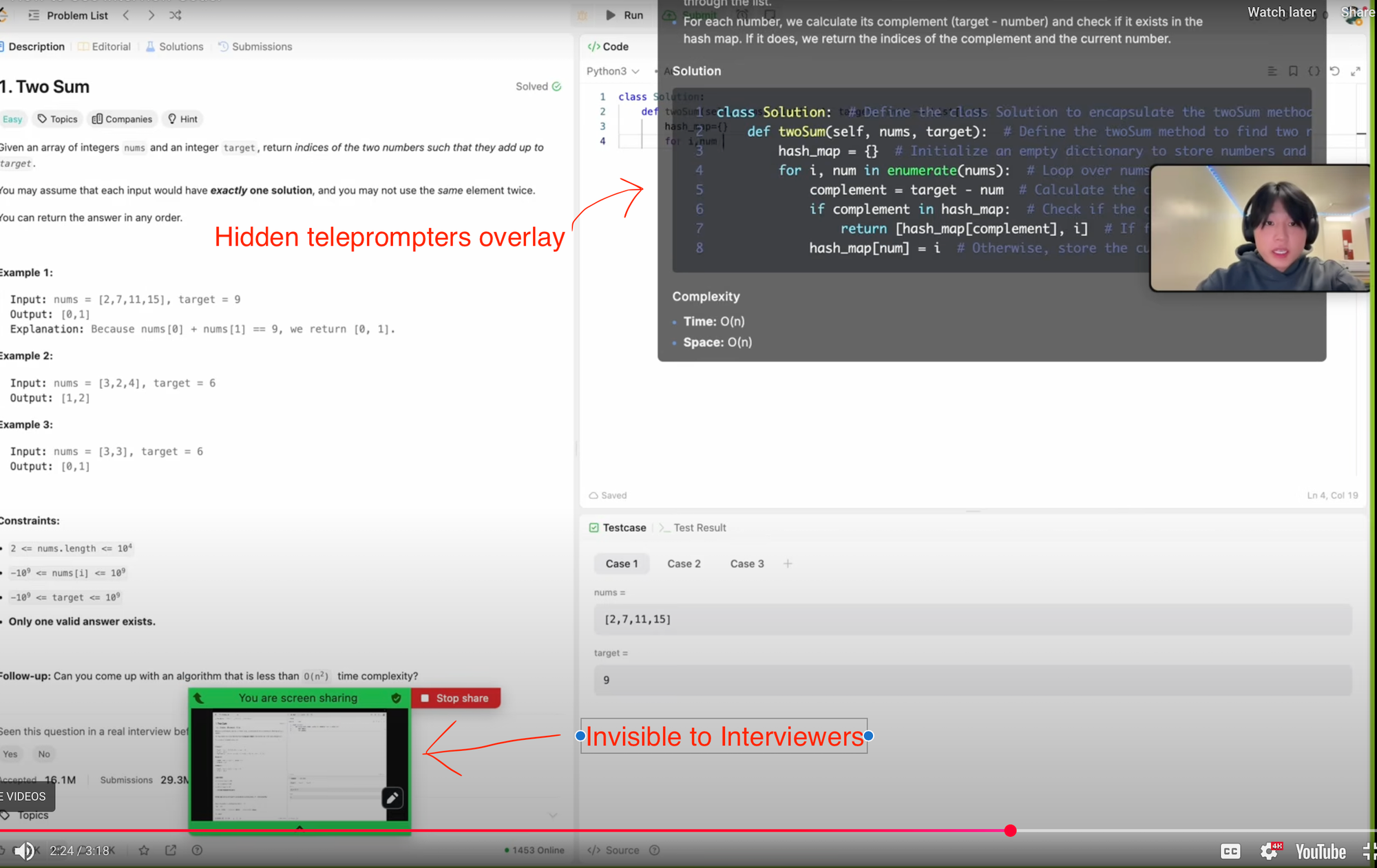 Even when not using advanced AI, many candidates exploit the remote setup by using multiple screens or devices to find answers. Think of it as having an open-book exam. A candidate might have Google or Stack Overflow open on a second monitor, or be furtively typing the interviewer’s questions into ChatGPT on their phone (if not using the fully automated pipeline described earlier). In coding interviews, some attempt to run code in an IDE on another screen or seek solutions online while stalling for time. This overlaps with general cheating, but AI makes it far easier – a candidate can copy-paste a technical question into an AI and get a structured answer almost instantly. Telltale signs: Quick, copy-and-paste sounding answers full of detail (more than the candidate’s normal speech) can be one. Interviewers sometimes hear keyboard tapping while they are asking a question – indicating the candidate is likely searching for it. To counter this, some tech firms now ask candidates to share their entire screen during virtual interviews, or use specialized proctoring software that flags if a candidate clicks away from the interview window. However, dedicated cheaters use workarounds: for example, multiple monitors (which screen-sharing might not capture), or a separate laptop next to them out of the web camera’s view. One student famously wrote software to overlay answers on his screen (visible only to him, not via screen share) to beat a major tech company’s interview – essentially a personal AR HUD for answers reddit.com. This kind of “DIY” cheating rig is likely to proliferate as tech-savvy grads try to outsmart hiring filters.
